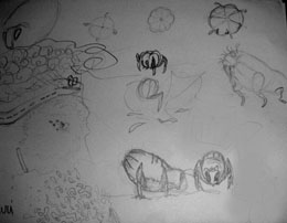 Early design sketches, alien designs, and map concepts from the Walkover development process.